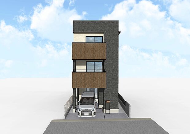 • 【完成予想図 ※図面を基に描いたもので実際とは異なります。】重厚感のあるの外壁に木目調の外壁が暖かさと安心感を演出。