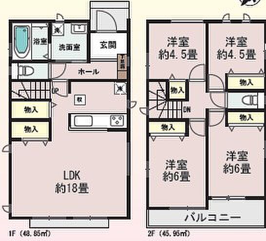 | 間取り | 4LDK 間取り内訳:洋室 6帖(2階)x2・洋室 4.5帖(2階)x2・リビングダイニングキッチン 18帖(1階) |