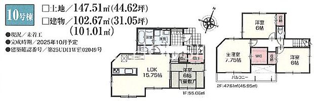 | 間取り | 4LDK 間取り内訳:リビングダイニングキッチン 15.7帖(1階)・洋室 6帖(1階)・洋室 7.7帖(2階)・洋室 6帖(2階)・洋室 6帖(2階) |