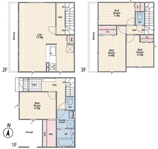 | 間取り | 4LDK 間取り内訳:洋室 6.1帖(1階)・リビングダイニングキッチン 17.1帖(2階)・洋室 6.6帖(3階)・洋室 5.1帖(3階)・洋室 4.7帖(3階) |