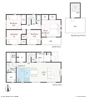 間取り内訳:リビングダイニングキッチン 18帖(1階)・洋室 5帖(2階)・洋室 4.5帖(2階)