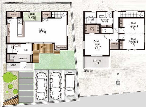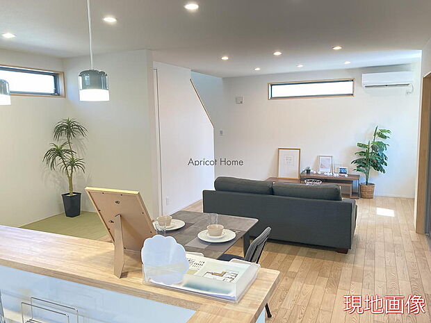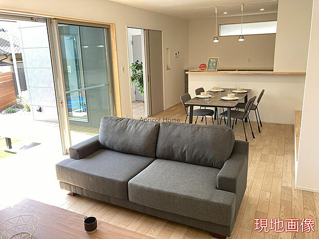 お庭とつながるワンフロア22帖の広々居住空間!パントリー・WICなど収納豊富!都市ガスエリア!家族のくつろぎの場として配置した小上がりの畳コーナー!奥行きあるバルコニー!カースペース並列3台可!