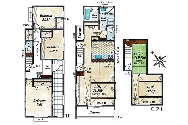 | 間取り | 3LDK 間取り内訳:洋室 7帖(1階)・洋室 5.2帖(2階)x2・リビングダイニングキッチン 21.5帖(2階) |