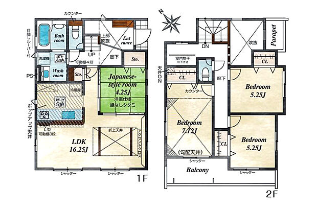 間取り内訳:リビングダイニングキッチン 16.2帖(1階)・和室 4.2畳(1階)・洋室 7.1帖(2階)・洋室 5.2帖(2階)x2