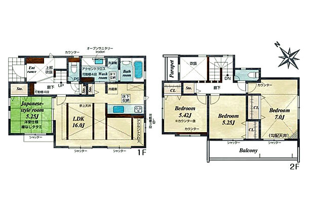 | 間取り | 4LDK 間取り内訳:リビングダイニングキッチン 16帖(1階)・和室 5.2畳(1階)・洋室 7帖(2階)・洋室 5.4帖(2階)・洋室 5.2帖(2階) |