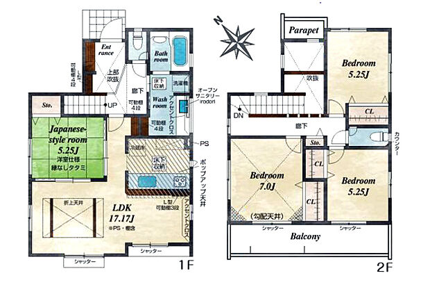 間取り内訳:リビングダイニングキッチン 17.1帖(1階)・和室 5.2畳(1階)・洋室 7帖(2階)・洋室 5.2帖(2階)x2