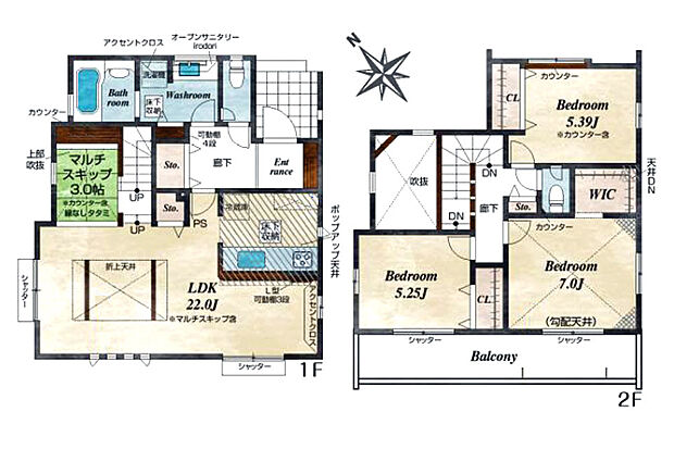 | 間取り | 3LDK 間取り内訳:リビングダイニングキッチン 22帖(1階)・洋室 7帖(2階)・洋室 5.3帖(2階)・洋室 5.2帖(2階) |