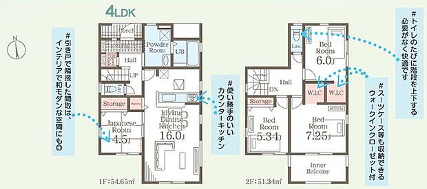 間取り内訳:リビングダイニングキッチン 16帖(1階)・和室 4.5畳(1階)・洋室 7.2帖(2階)・洋室 6帖(2階)・洋室 5.3帖(2階)