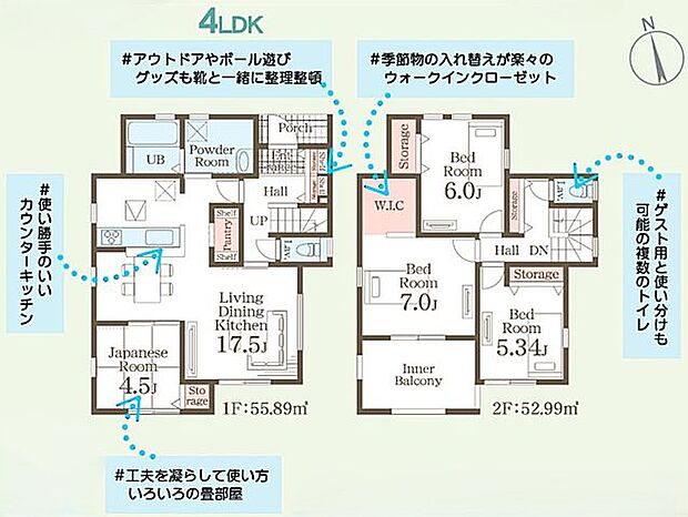 | 間取り | 4LDK 間取り内訳:リビングダイニングキッチン 17.5帖(1階)・和室 4.5畳(1階)・洋室 7帖(2階)・洋室 6帖(2階)・洋室 5.3帖(2階) |