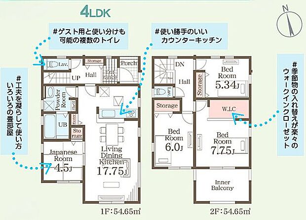 | 間取り | 4LDK 間取り内訳:リビングダイニングキッチン 17.7帖(1階)・和室 4.5畳(1階)・洋室 7.7帖(2階)・洋室 6帖(2階)・洋室 5.3帖(2階) |