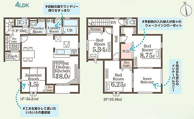 | 間取り | 4LDK 間取り内訳:リビングダイニングキッチン 18帖(1階)・和室 4.5畳(1階)・洋室 8.7帖(2階)・洋室 6.2帖(2階)・洋室 5.3帖(2階) |
