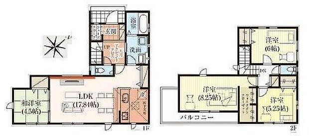 | 間取り | 4LDK 間取り内訳:リビングダイニングキッチン 17.8帖(1階)・和室 4.5畳(1階)・洋室 5.2帖(2階)・洋室 6帖(2階)・洋室 8.2帖(2階) |