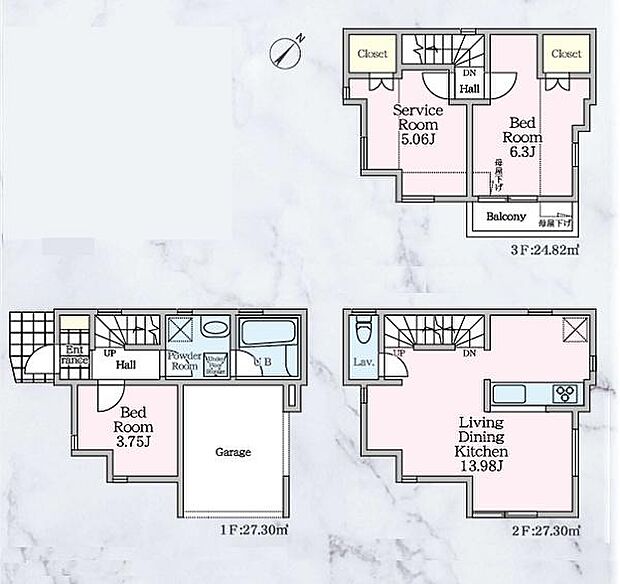 | 間取り | 2SLDK 間取り内訳:洋室 3.7帖(1階)・リビングダイニングキッチン 13.9帖(2階)・洋室 6.3帖(3階)・収納 5帖(3階) |