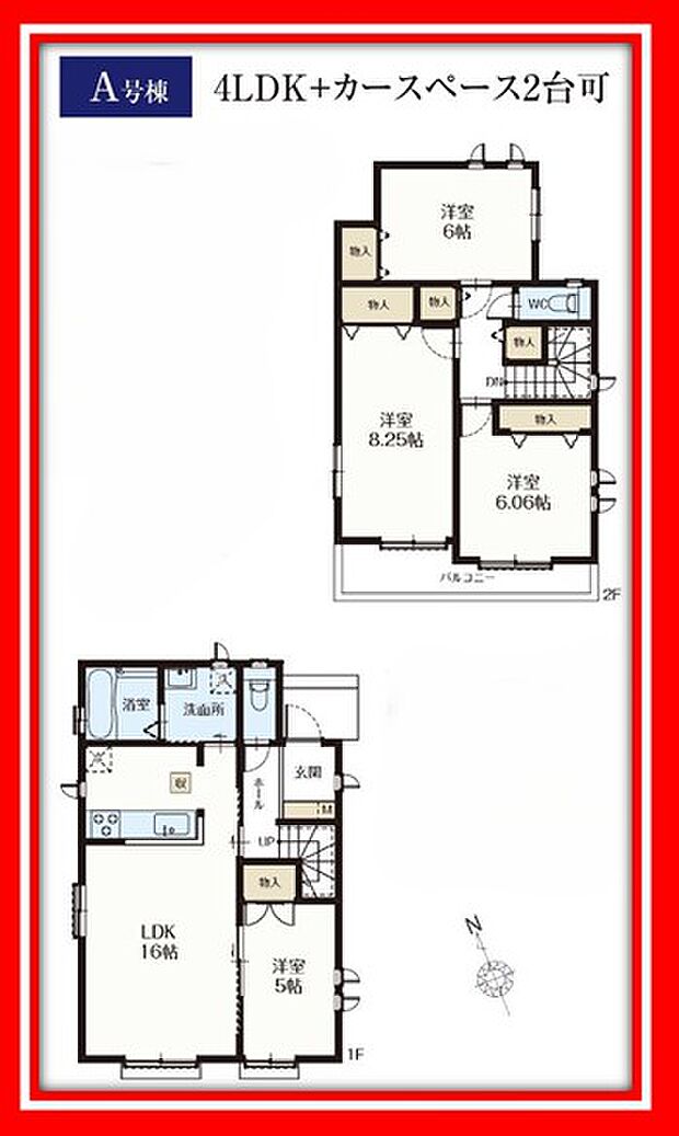 | 間取り | 4LDK 間取り内訳:リビングダイニングキッチン 16帖(1階)・洋室 5帖(1階)・洋室 6帖(2階)・洋室 6帖(2階)・洋室 8.2帖(2階) |