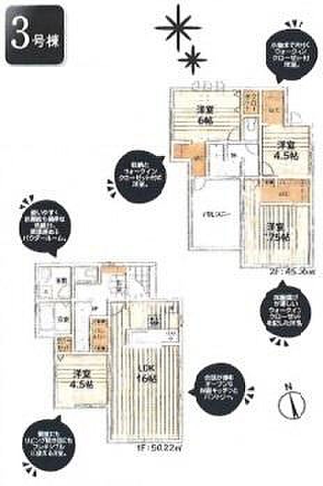 | 間取り | 4LDK 間取り内訳:リビングダイニングキッチン 16帖(1階)・洋室 4.5帖(1階)・洋室 7.7帖(2階)・洋室 6帖(2階)・洋室 4.5帖(2階) |