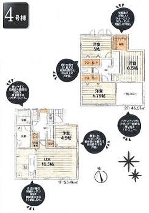 | 間取り | 4LDK 間取り内訳:リビングダイニングキッチン 16.5帖(1階)・洋室 4.5帖(1階)・洋室 6.7帖(2階)・洋室 6.5帖(2階)・洋室 6帖(2階) |