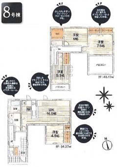 | 間取り | 4LDK 間取り内訳:リビングダイニングキッチン 16.5帖(1階)・洋室 4.5帖(1階)・洋室 7.5帖(2階)・洋室 6帖(2階)・洋室 5.5帖(2階) |