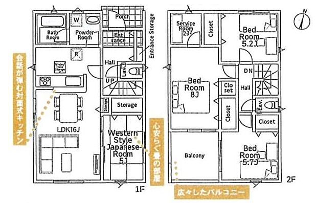 間取り内訳:リビングダイニングキッチン 16帖(1階)・和室 5畳(1階)・洋室 5.2帖(2階)・洋室 8帖(2階)・洋室 5.7帖(2階)
