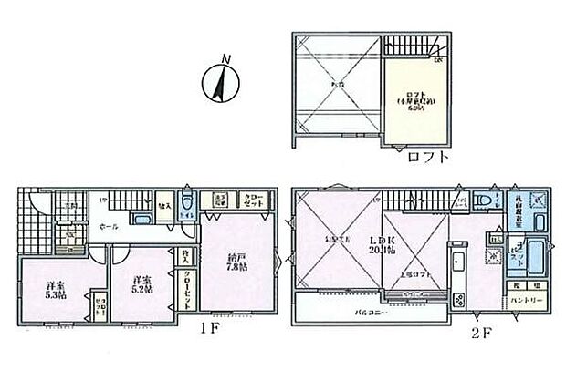 | 間取り | 2SLDK 間取り内訳:洋室 5.3帖(1階)・洋室 5.2帖(1階)・収納 7.8帖(1階)・リビングダイニングキッチン 20.4帖(2階) |