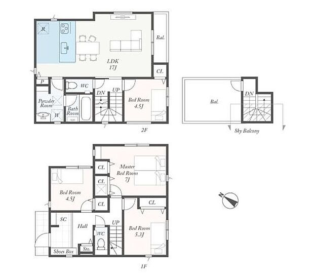 | 間取り | 4LDK 間取り内訳:洋室 4.5帖(1階)・洋室 5.3帖(1階)・洋室 7帖(1階)・リビングダイニングキッチン 17帖(2階)・洋室 4.5帖(2階) |