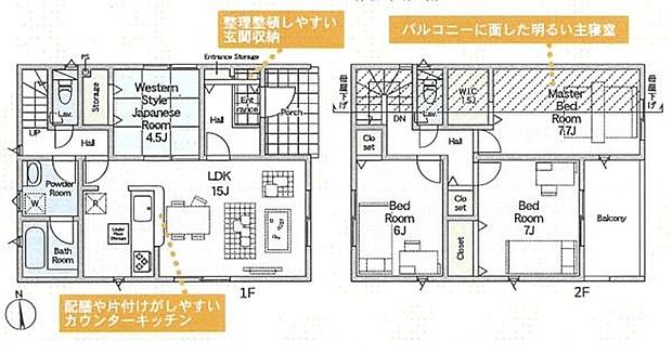 | 間取り | 4LDK 間取り内訳:リビングダイニングキッチン 15帖(1階)・和室 4.5畳(1階)・洋室 6帖(2階)・洋室 7帖(2階)・洋室 7.7帖(2階) |