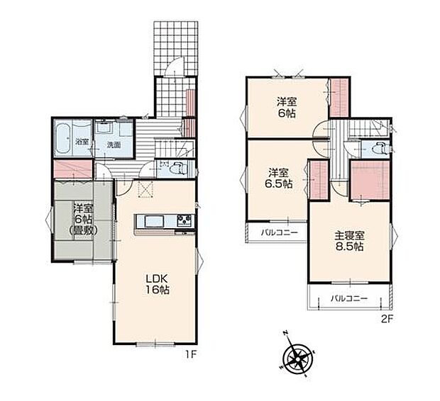 | 間取り | 4LDK 間取り内訳:リビングダイニングキッチン 16帖(1階)・和室 6畳(1階)・洋室 6帖(2階)・洋室 6.5帖(2階)・洋室 8.5帖(2階) |