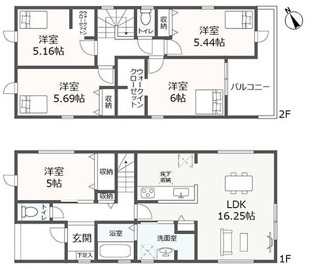 | 間取り | 5LDK 間取り内訳:リビングダイニングキッチン 16.2帖(1階)・洋室 5帖(1階)・洋室 6帖(2階)・洋室 5.6帖(2階)・洋室 5.4帖(2階)・洋室 5.1帖(2階) |