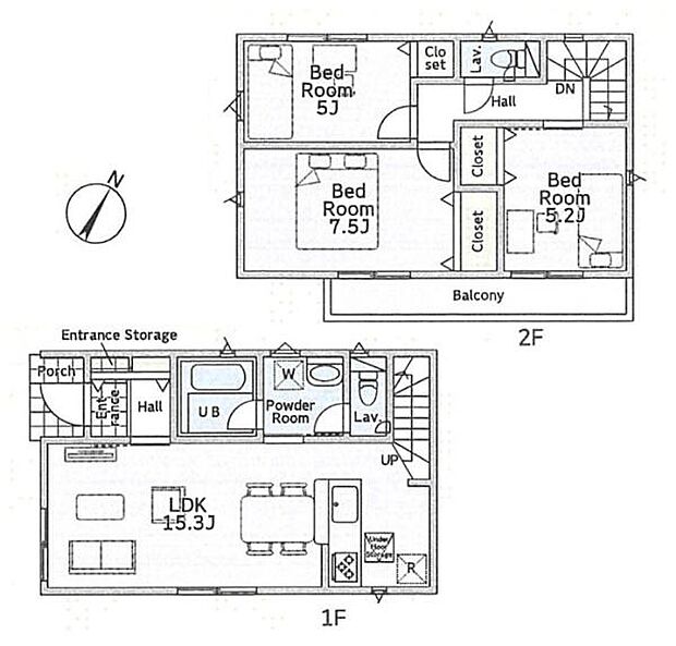 | 間取り | 3LDK 間取り内訳:リビングダイニングキッチン 15.3帖(1階)・洋室 5帖(2階)・洋室 7.5帖(2階)・洋室 5.2帖(2階) |