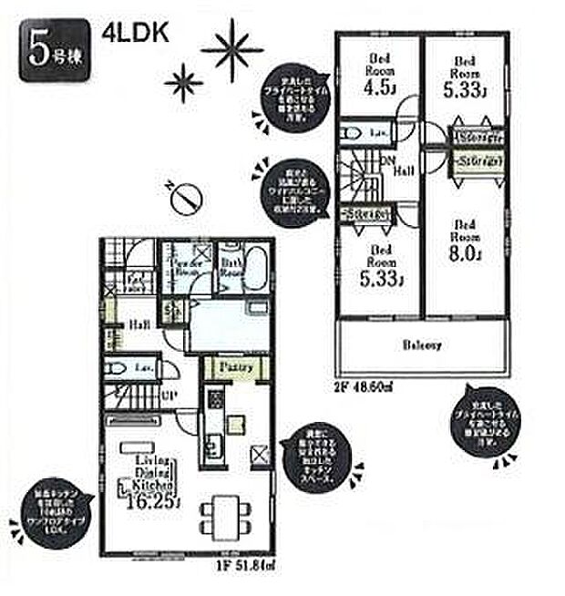 | 間取り | 4LDK 間取り内訳:リビングダイニングキッチン 16.2帖(1階)・洋室 8帖(2階)・洋室 5.3帖(2階)・洋室 5.3帖(2階)・洋室 4.5帖(2階) |