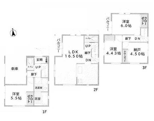 | 間取り | 3SLDK 間取り内訳:洋室 5.5帖(1階)・リビングダイニングキッチン 16.5帖(2階)・洋室 6帖(3階)・洋室 4.4帖(3階)・収納 4.5帖(3階) |