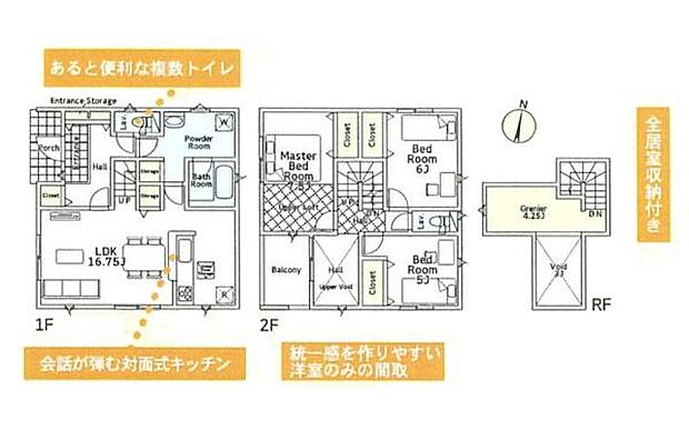 | 間取り | 3LDK 間取り内訳:リビングダイニングキッチン 16.7帖(1階)・洋室 5帖(2階)・洋室 6帖(2階)・洋室 7.5帖(2階) |