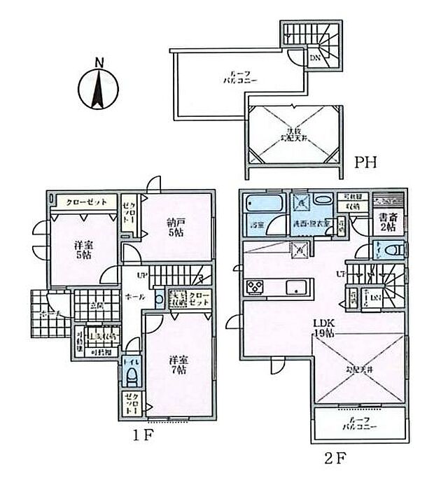 | 間取り | 2SLDK 間取り内訳:洋室 5帖(1階)・収納 5帖(1階)・洋室 7帖(1階)・リビングダイニングキッチン 19帖(2階) |