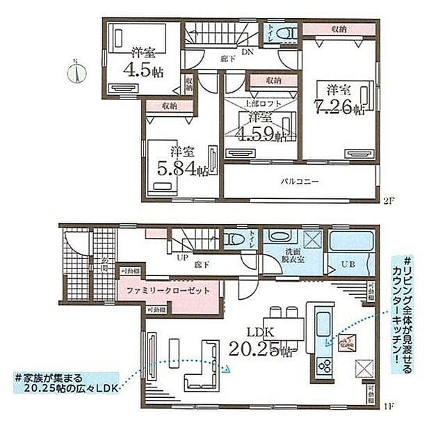 家族が集まる広々としたLDK。便利なファミリークロークあり。ロフト付きの4LDK。