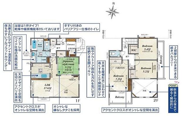 | 間取り | 4LDK 間取り内訳:リビングダイニングキッチン 17.6帖(1階)・和室 5.2畳(1階)・洋室 7.2帖(2階)・洋室 5.2帖(2階)・洋室 5.4帖(2階) |