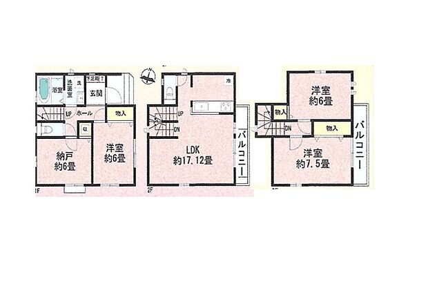 | 間取り | 3SLDK 間取り内訳:収納 6帖・洋室 6帖・リビングダイニングキッチン 17.1帖・洋室 6帖・洋室 7.5帖 |