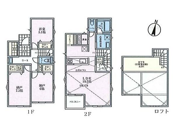 間取り内訳:洋室 5.1帖(1階)・収納 6帖(1階)・収納 7.2帖(1階)・リビングダイニングキッチン 19.5帖(2階)