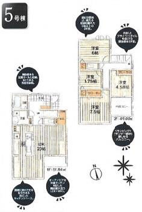 間取り内訳:リビングダイニングキッチン 20帖(1階)・洋室 7.5帖(2階)・洋室 6帖(2階)・洋室 4.5帖(2階)・洋室 3.7帖(2階)
