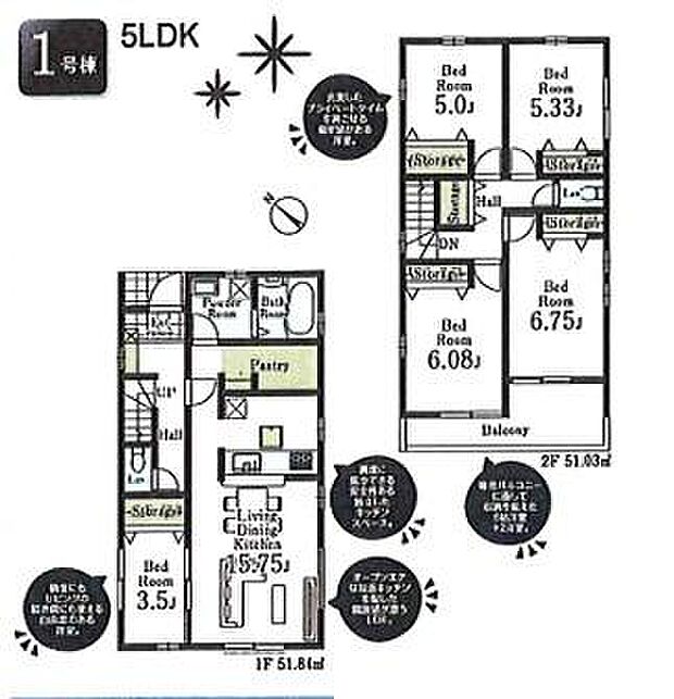 | 間取り | 5LDK 間取り内訳:リビングダイニングキッチン 15.7帖(1階)・洋室 3.5帖(1階)・洋室 6.7帖(2階)・洋室 6帖(2階)・洋室 5.3帖(2階)・洋室 5帖(2階) |