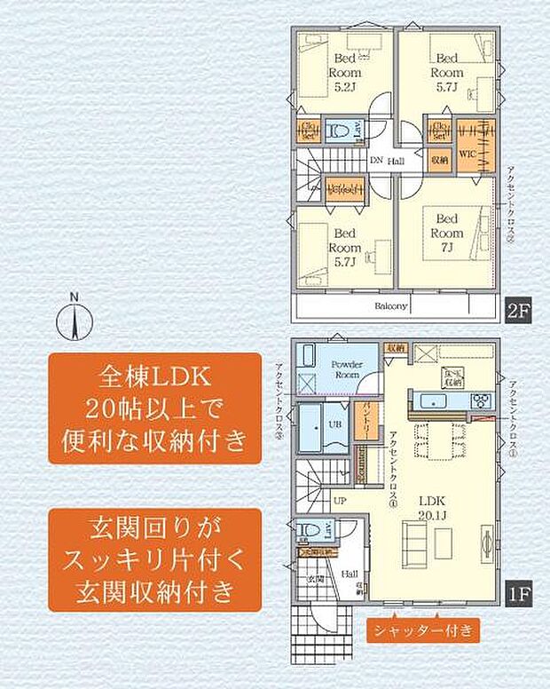 | 間取り | 4LDK 間取り内訳:洋室 7帖(2階)・洋室 5.7帖(2階)・洋室 5.2帖(2階)・リビングダイニングキッチン 20.1帖(1階)・洋室 5.7帖(2階) |