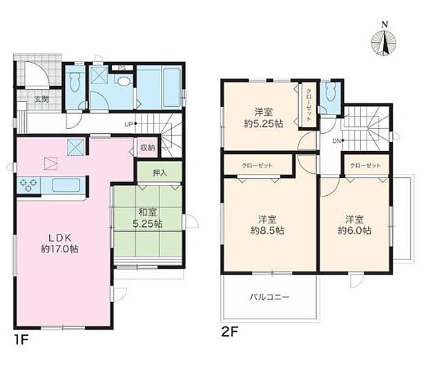 | 間取り | 4LDK 間取り内訳:リビングダイニングキッチン 17帖(1階)・和室 5.2畳(1階)・洋室 5.2帖(2階)・洋室 8.5帖(2階)・洋室 6帖(2階) |