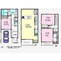 | 間取り | 4LDK 間取り内訳:洋室 7.3帖(1階)・リビングダイニングキッチン 18.6帖(2階)・洋室 5.1帖(3階)・洋室 5.9帖(3階)・洋室 6.6帖(3階) |