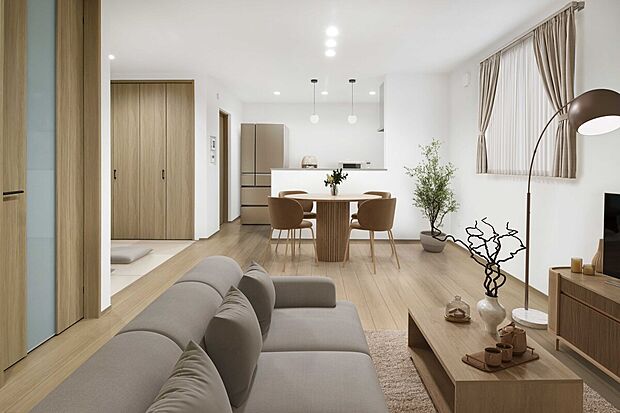 • 【No.2号棟  広々18.7帖のLDK】家族が自然と集まる広々LDK18.7帖。リビング・ダイニング・キッチンがゆるやかにつながり、子どもが遊ぶ様子を見守りながら家族でゆったり過ごせる空間です。※家具・家電・小物はCGによるイメージです。
