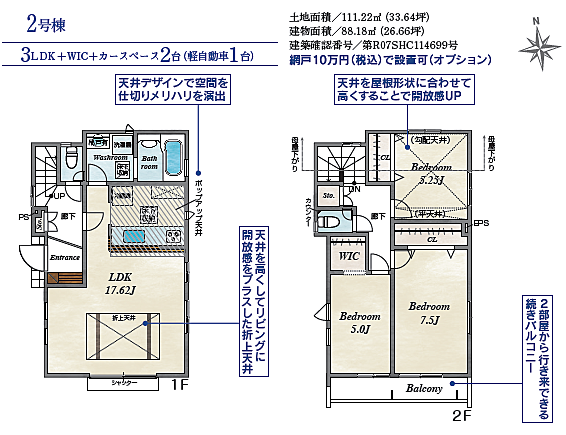 間取り内訳:リビングダイニングキッチン 17.6帖(1階)・洋室 7.5帖(2階)・洋室 5.2帖(2階)・洋室 5帖(2階)
