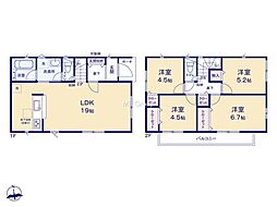| 間取り | 4LDK 間取り内訳:洋室 4.5帖(2階)・洋室 4.5帖(2階)・リビングダイニングキッチン 19帖(1階)・洋室 6.7帖(2階)・洋室 5.2帖(2階) |