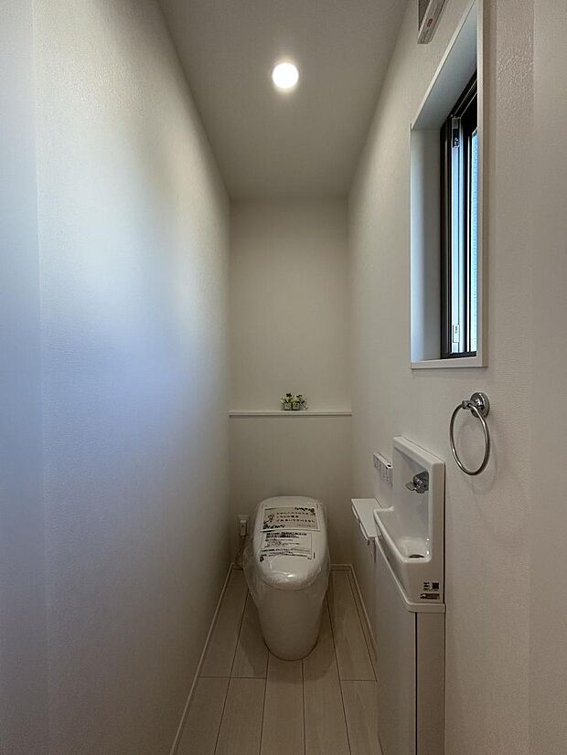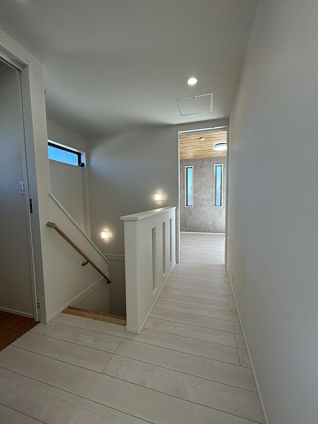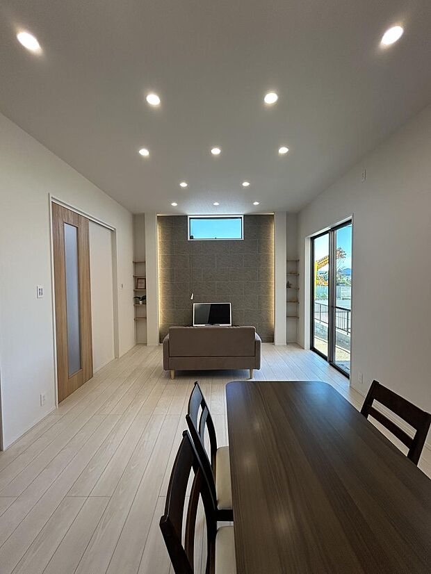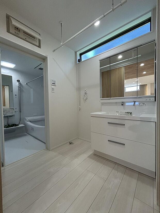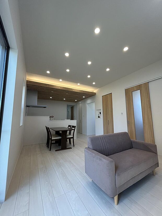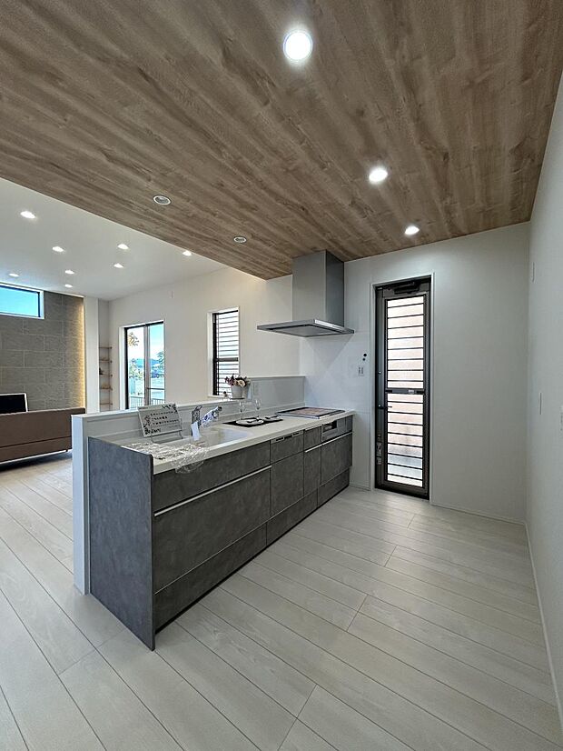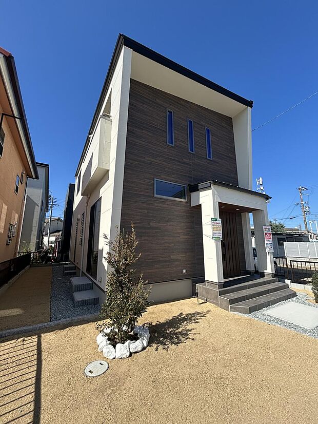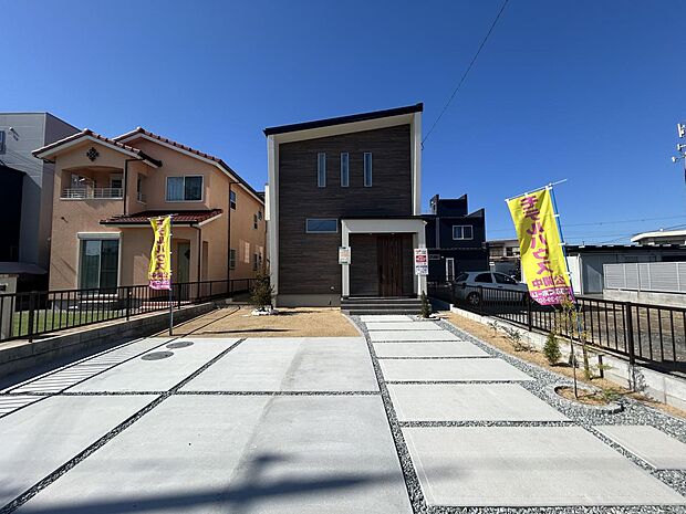 ホワイト系とブラウン系でスタイリッシュなモダンデザインです♪キッチンの後ろにお風呂と洗面所とファミリークローゼットがある人気の水回り家事動線!!スッキリ片付く設計のお家です。