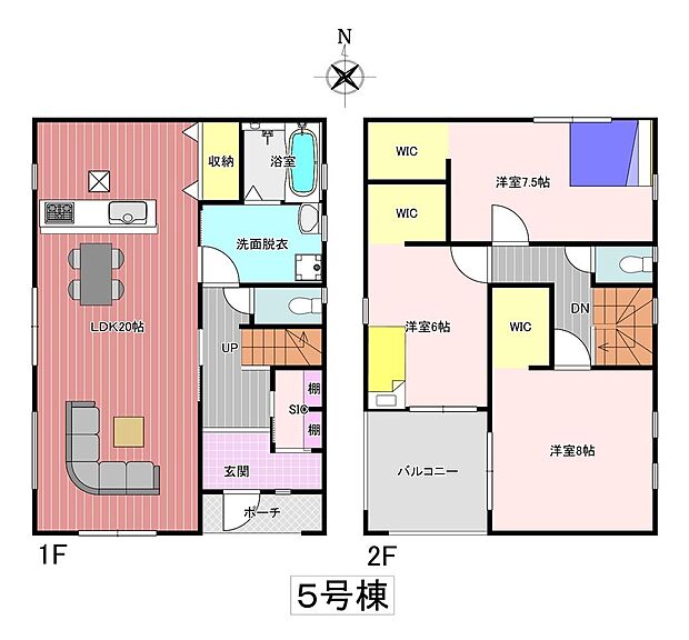 間取り内訳:リビングダイニングキッチン 20帖(1階)・洋室 6帖(2階)・洋室 7.5帖(2階)・洋室 8帖(2階)