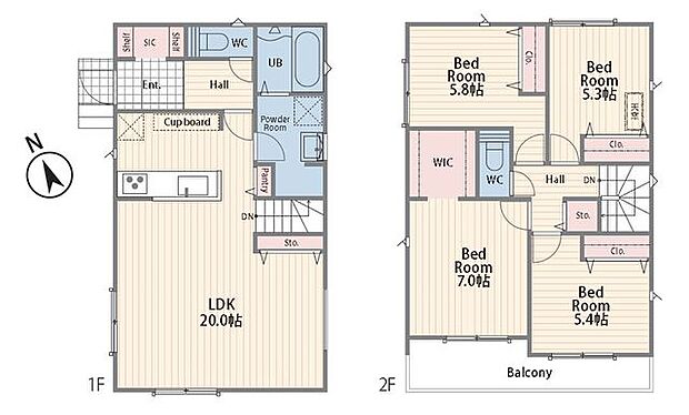 | 間取り | 4LDK 間取り内訳:リビングダイニングキッチン 20帖(1階)・洋室 7帖(2階)・洋室 5.8帖(2階)・洋室 5.4帖(2階)・洋室 5.3帖(2階) |