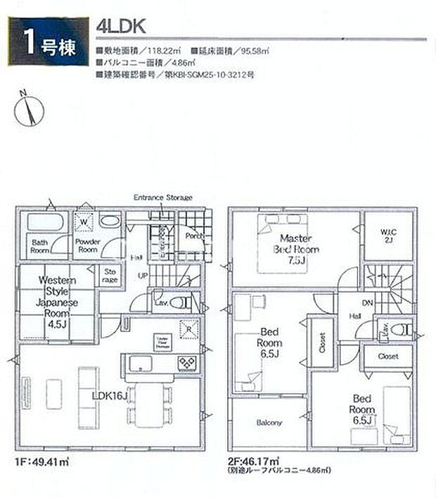 | 間取り | 4LDK 間取り内訳:洋室 7.5帖(2階)・洋室 6.5帖(2階)・洋室 6.5帖(2階)・リビングダイニングキッチン 16帖(1階)・和室 4.5畳(1階) |