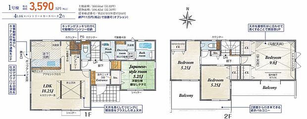 間取り内訳:和室 5.2畳(1階)・リビングダイニングキッチン 18.2帖(1階)・洋室 9帖(2階)・洋室 5.2帖(2階)・洋室 5.2帖(2階)