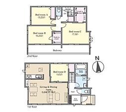 間取り内訳:リビングダイニングキッチン 18帖(1階)・洋室 5帖(2階)・洋室 5.2帖(2階)・洋室 6帖(2階)・洋室 7帖(2階)